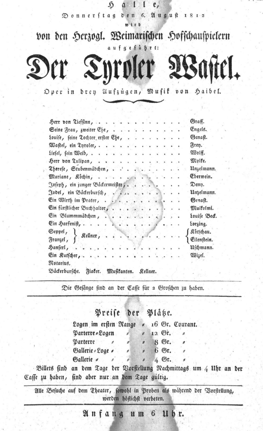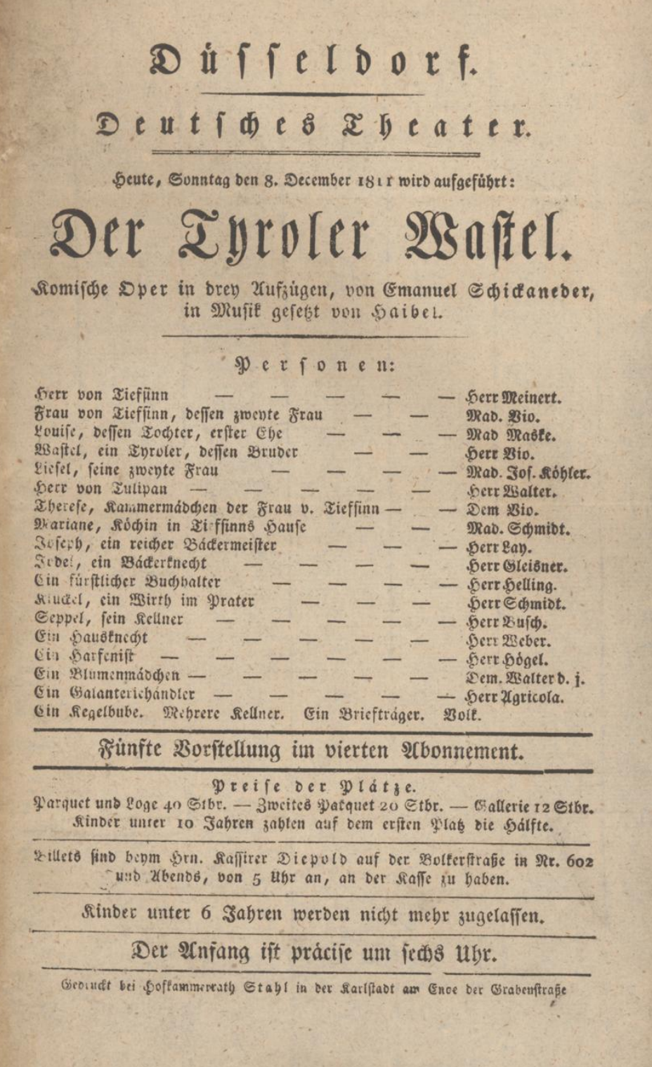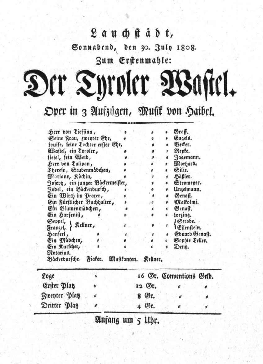 - 08.12.1811 in Düsseldorf (Deutsches Theater) „Der Tyroler Wastel“