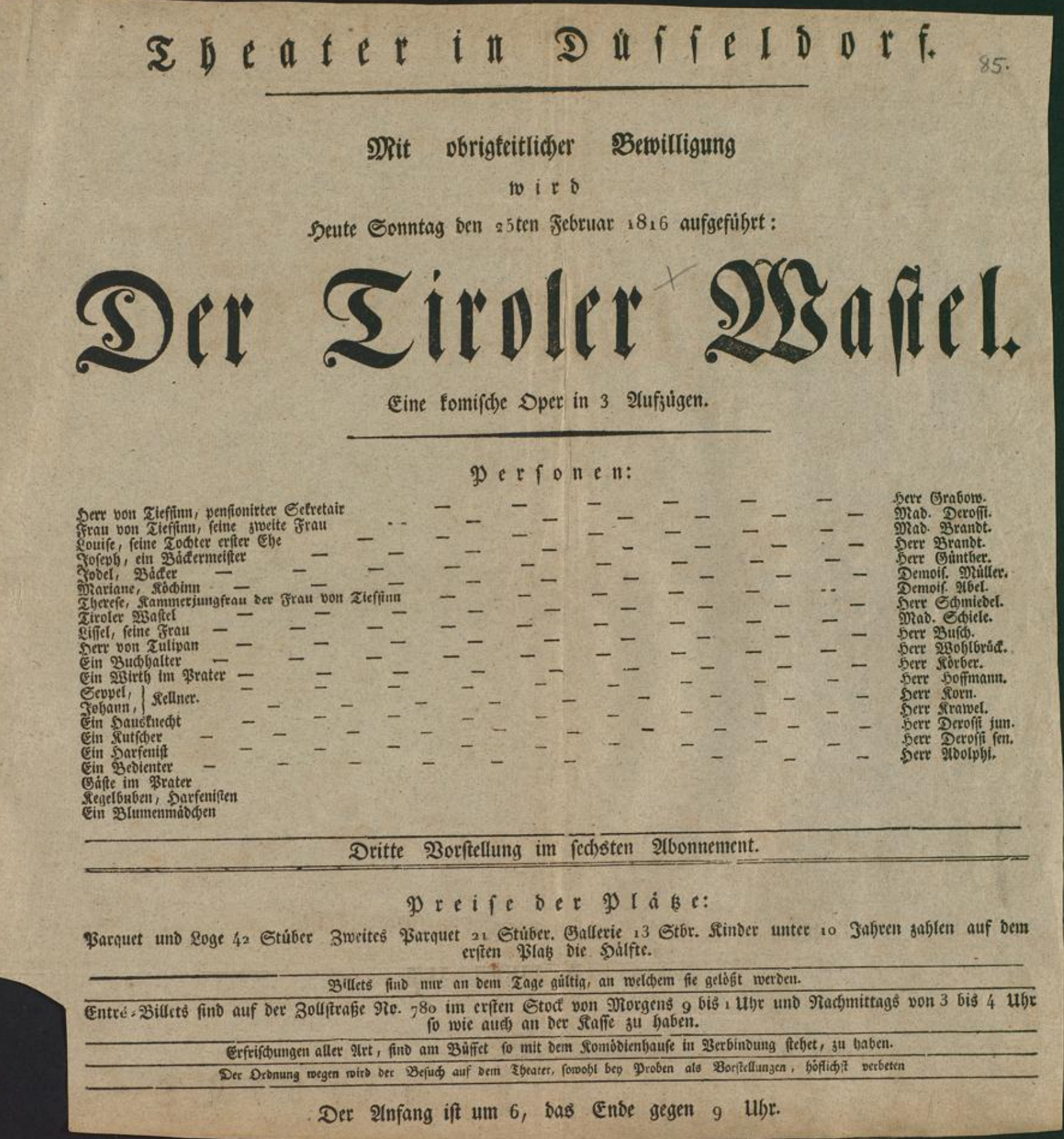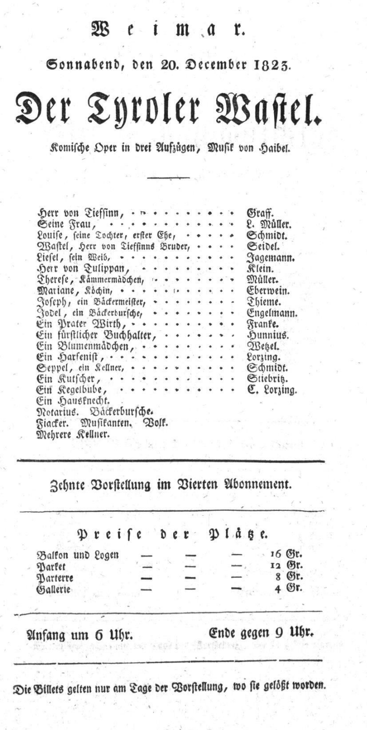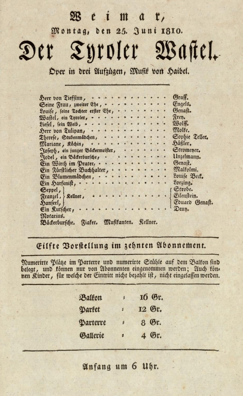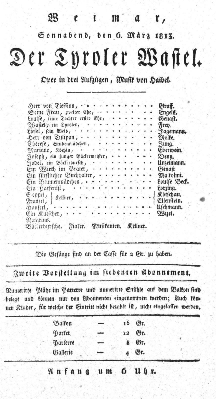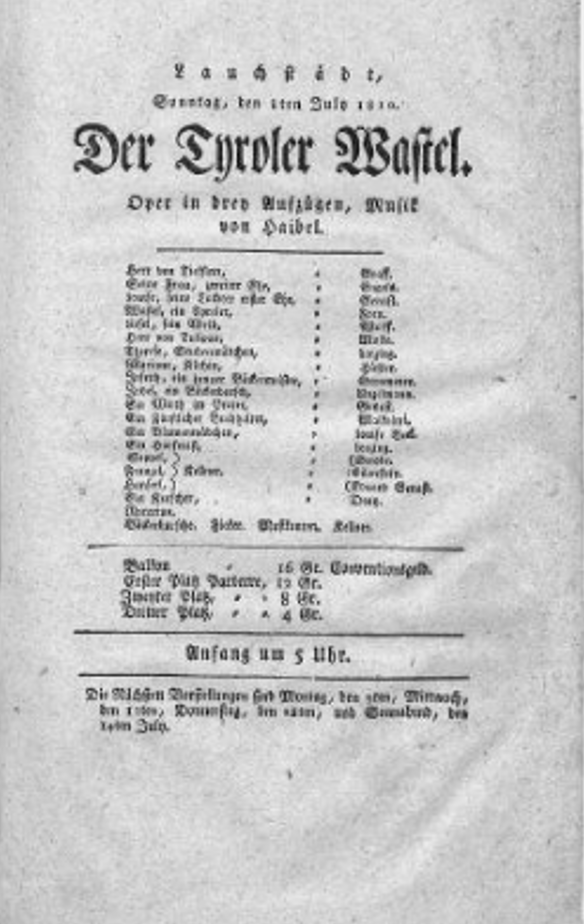 - 25.02.1816 in Düsseldorf (Theater in Düsseldorf) „Der Tiroler Wastel“